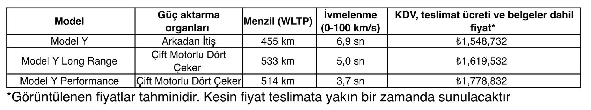 Model Y Long Range, çift motorlu dört çeker araç. Menzili 533 km olan aracın fiyatı ise 1 milyon 619 bin 532 TL.